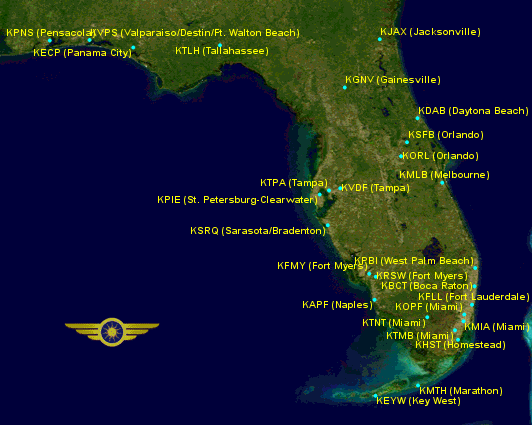 RMA has partnered with a small operator based in Key West, Florida. Trading under the name of Sun Chaser, this operation has Galveston, Texas as a focus city, and operates the Embraer Phenom 300 for jet charter services. These jet services may involve emergency transportation for oil rig workers out of Galveston, or college football game charters within the SEC footprint. The textures and SunChaser callsign for N33040 are found within the RMA Phenom 300 download on the Fleet page. Also operated are light twin piston props, like the Beech Baron and Duke, and single turboprops, like the Piper Meridian or members of the TBM family, but these are left to the individual pilot's discretion. The smallest member of the fleet is a Lancair Legacy, used for rentals and occasional flight crew repositioning. The map below displays the Florida service area, with the piston types generally not venturing north of the Fort Meyers-West Palm Beach line. Single turboprops have been known to serve the Bahamas, as well as the Florida panhandle area.